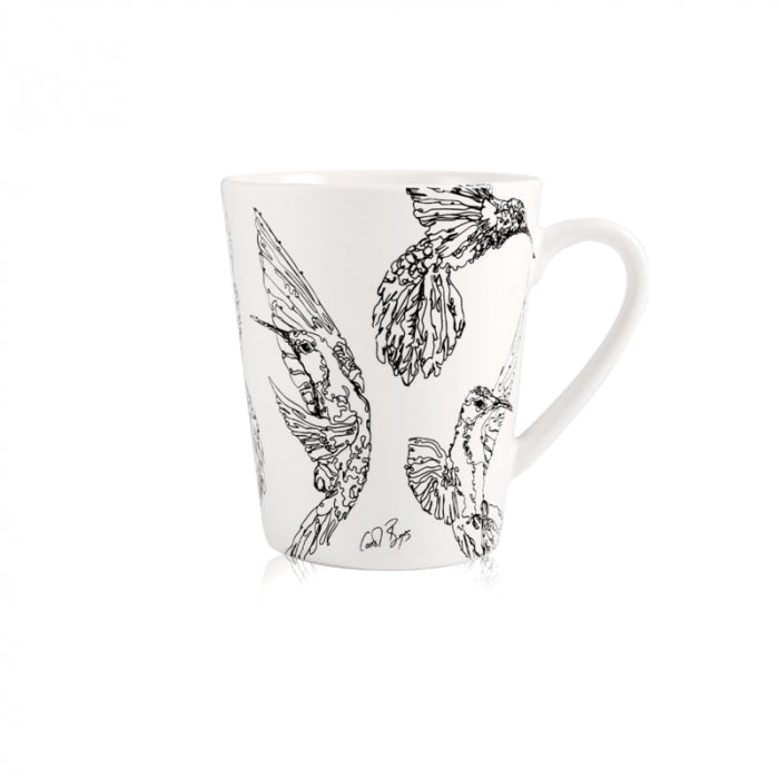 The Sugarbird mug - white, features exquisite, minimalist artwork by Caro, niece of Carrol Boyes. With a semi-matte finish, each mug features illustrations of the Cape Sugarbird, captured exquisitely in various poses of flight.