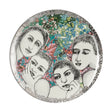The Kaleidoscope Range Round Platter – garden party is crafted from Fine Bone China. It features four classic sketchbook faces captured against artistic floral hues of green and pink, framed by metallic platinum embellishments. Use it for all types of events and foods. Hand wash. Store with protective material between Platters.