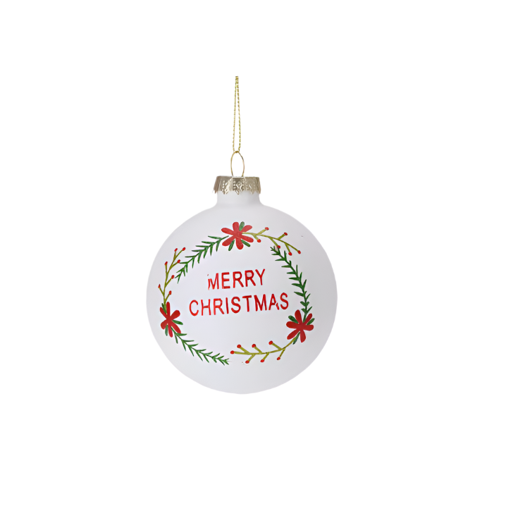 Xmas Ball with Merry Christmas Wording, Matt Glass, 8cm, White